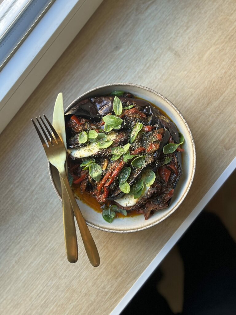 - Enfournez à 220°C 10 min d’un côté puis 10 min de l’autre. Ou placez au AirFryer pour la même durée à 200°C (la chair de l’aubergine doit être entièrement fondante).